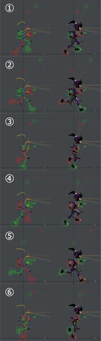 作ったポーズは①~③の3つで、鏡面のポーズを合わせて6つのキーポーズで走らせています。