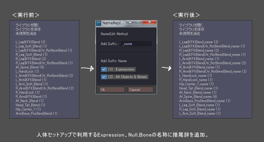 このLスクリプトはExpressionと全てのNullとBoneの名称に接尾辞を追加します。