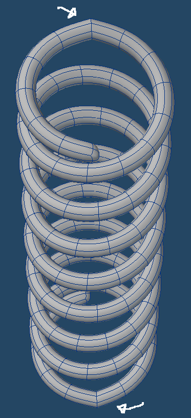 回転体で始端と終端のバネのポリゴンを追加しても、モーフによる伸縮表現が維持出来ているかと思います。