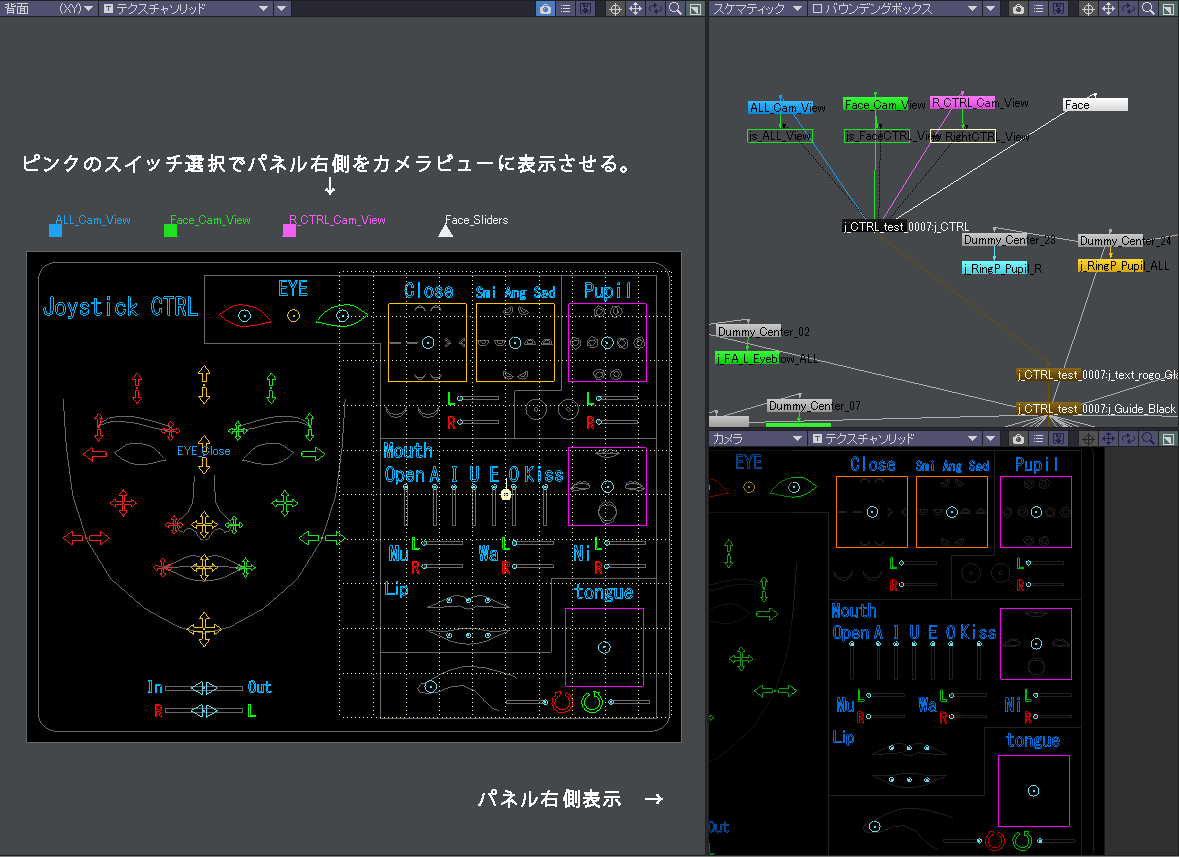 これでキャラクターのサイズに合わせてJoystick_CTRLをスケール調整しても、片面にキャラクターの顔を表示させつつ、もう片面のカメラビュー上でパネルを操作してフェイシャルモーションをスムーズに付けていく事が出来るようになりました。