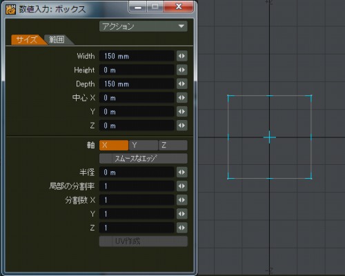 1.プリミティブから「Box」を選び数値入力のパネルを編集していきます。