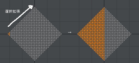 5.上面ビューから折り紙の左端のポリゴンを選択して「選択拡張」で半分まで選択していきます。