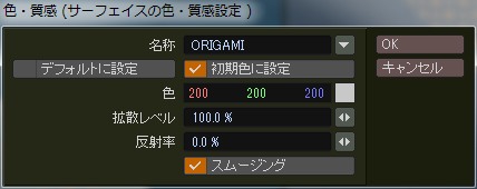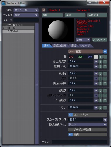 2.「両面」オンにしてポリゴンの裏表を表示、「スムージング」オン(スムースしきい値:180°)にします。