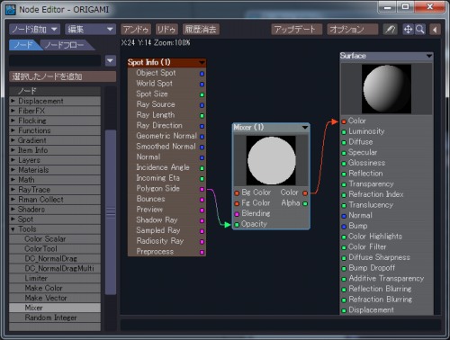 4.ノード追加→Spotから「Spot Info」を、Toolsから「Mixer」を追加してノードを繋げます。