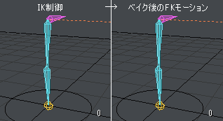 通常のIK制御では、ボーンの動き(回転値)をモーションベイク関連のコマンドで焼きこむ事ができます。