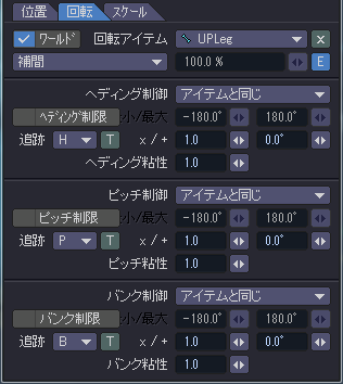 回転アイテムを「UPLeg」にしてH,P,Bを「アイテムと同じ」にする。