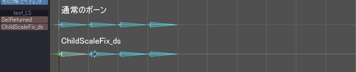 腕の伸び縮みに対し、手のボーンのスケールはそのまま。ろくろ首の頭の大きさをそのままにしたいとか、スケールの影響を受けたくない子ボーンに有効な方法だと思います。