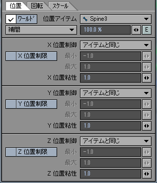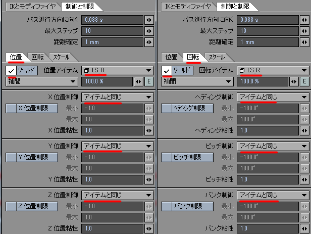 【モーション】パネルを開き →【制御と制限】タブを選択 →【位置】&【回転】タブの設定を下の画像のように設定します。