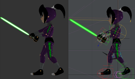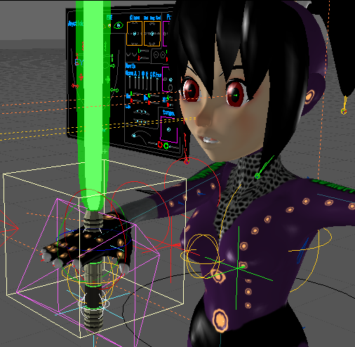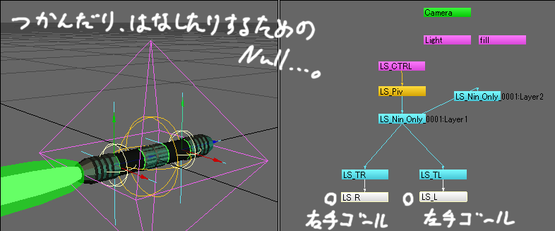 ここまで出来上がったら、ライトセイバーのリグとモデルのリグを繋げていく作業に入ります。