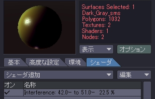 あと、メタビーの黒色のパーツ(特に角とか)にはうっすらと安っぽい鉄の油膜のような質感を与えたいのでシェーダ追加からInterferenceを追加します。