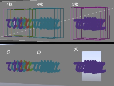 しかし、これらのオブジェクトが重なり合うアングルになると後ろのオブジェクトが透過してしまいます。