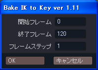 1.統括プラグイン内から「BakeIKtoKey」を選択して、フレーム範囲入力後にOKを押す。