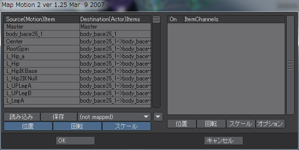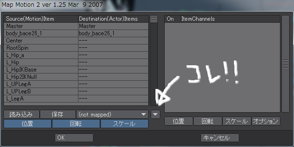 そのまま何もいじらずにOKを押すとオブジェクトアイテムの動きしか読み込めないので、真ん中の【▼】からモデルのオブジェクトアイテム名を選択することで、ボーンの動きも読み込むことが出来ます。