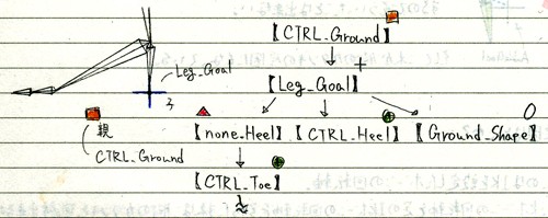 LegGoalはATZの片足の全体制御用のアイテムに当たるものになりますが、あくまで足の裏の中心で制御したいのでCTRL_Groundを一番親にして足を制御します。