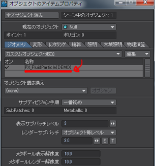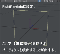 そしたら、先ほどの【オブジェクトのアイテムP(プロパティ)】内の「PX_FluidParticle」をダブルクリックしてパネルを表示させて「演算開始」を押して噴射方向を確認しよう。