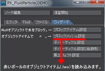 そのまま「PX_FluidParticle」パネルの「ウィザード」タブ内のブロックメッシュ設定をクリックして、障害物となる.lwoデータを選択して読み込んでください。