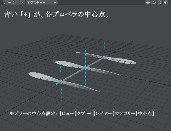 モデラー、レイアウト、どちらでも良いのでプロペラ3つの中心点を下の画像のようにあらかじめ設定しておきます。