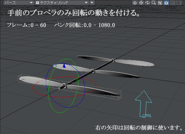 ここで回転が遅かったり早かったり、回転時間が長かったり短かったりと修正したい場合は、手前のプロペラのバンク回転の数値とフレームだけを修正するだけで、真ん中と奥のプロペラも自動的に修正されます。