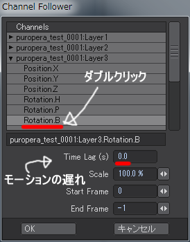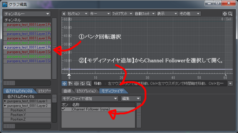 【Channnels】のリストから手前のプロペラのバンク回転(Rotation.B)をダブルクリックします。