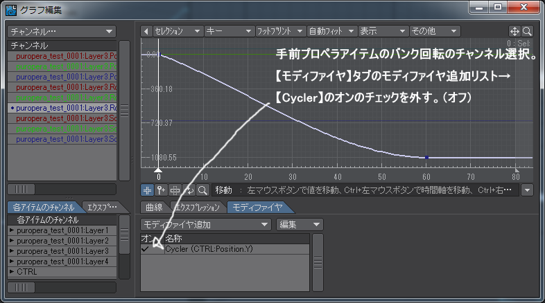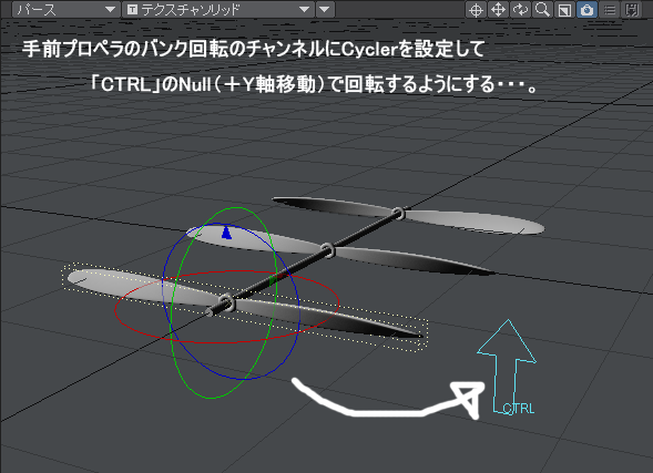 手前プロペラのバンク回転(元の回転)のチャンネルにCyclerを設定して、制御用に使うアイテムのチャンネルを当てはめていきましょう。