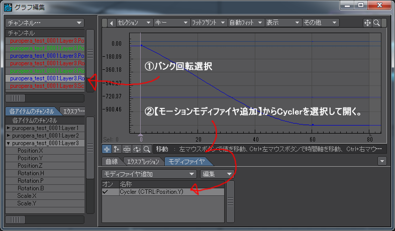 ChannelFollwerを設定した複数の動きをループモーション(連続回転)させるには、グラフ編集で設定していきます。