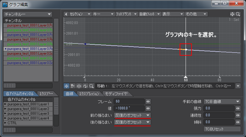 そのまま【曲線】タブに移り、60フレームのキーを選択して