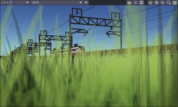 電車は2つの異なる色のオブジェクトが重なり合っていて、トンネルに入ると真っ黒な電車に変化します。ほんの一瞬ですけど、トンネル入り口でスラーッと変わってます。半透明化は出来ないので使いどころが限られますが、こういった面白い表現が簡単に作れるのは良いですね。今回の動画作りでは多用していきそうです。